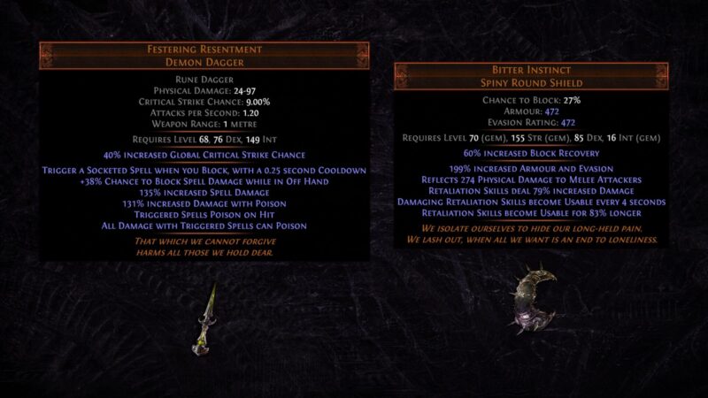 - Festering Resentment (強まる恨み): ウーバー無視の化身戦からドロップ。毒が染み込んだ刃で、トリガーで発動する全てのスペルが与える全てのダメージ属性で毒を付与できるようにします。これによりトリガーを中心とした毒の狂騒を可能にします。